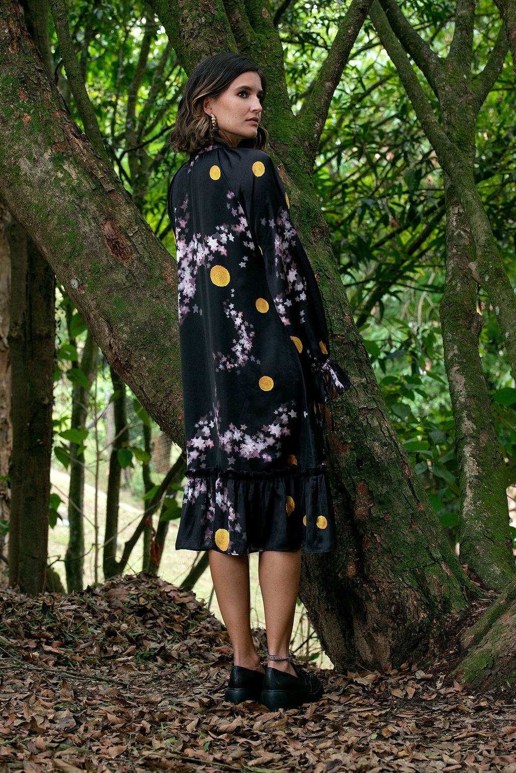 VESTIDO NEGRO SEDOSO CON ESTAMPADO POLKA DOTS EN DORADO