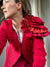 Confeccionado en tonos intensos y cálidos, este blazer destaca por la fuerza simbólica de su rosa protagonista: una flor que renace en degradados de rojo y naranja, evocando vida, fuego y determinación.