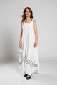 Este amplio vestido con cuello y tiras decorativas, manga raglán con tiras de amarre y bolero en el bajo. Es muy fresco y cómodo para climas cálidos. Altura del modelo: 1,67