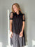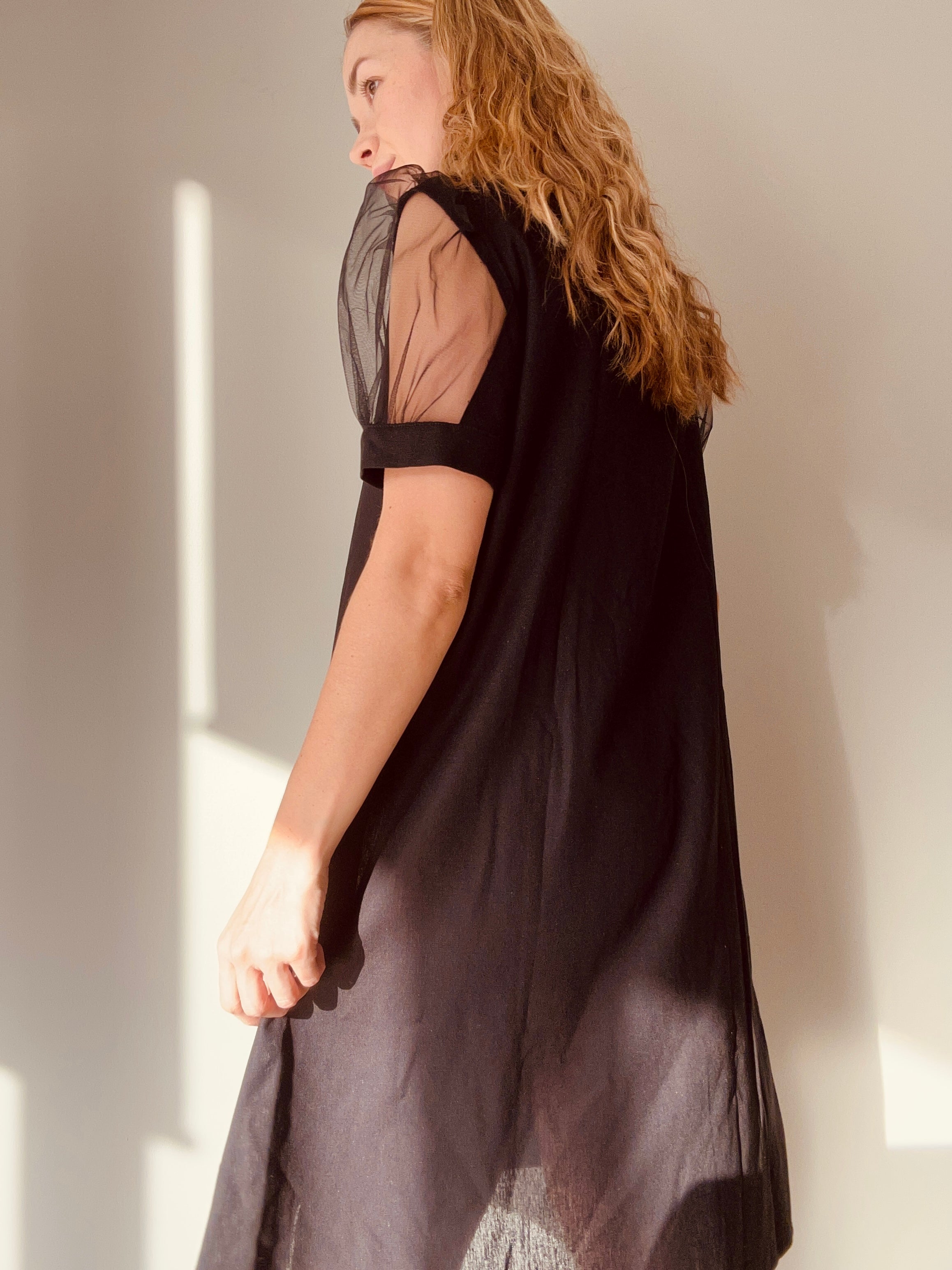 Este vestido negro presenta una manga globo en tull color negro. Una silueta en Línea A, comoda y muy versátil.