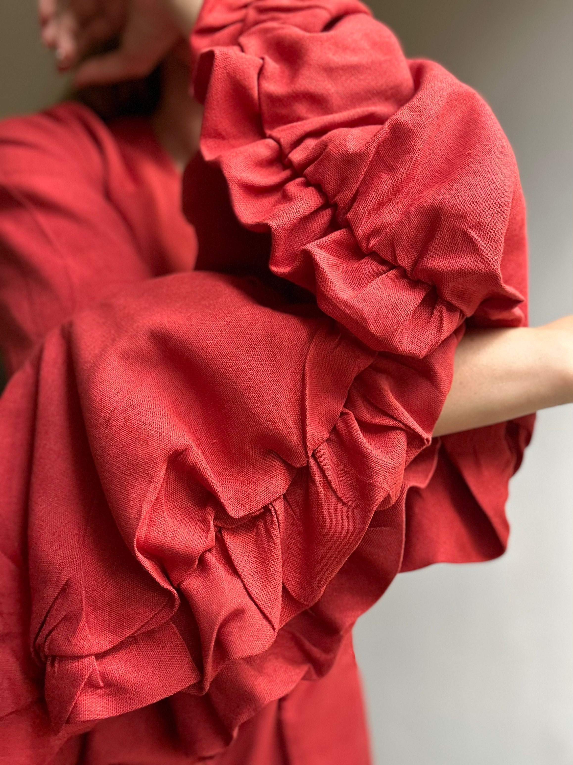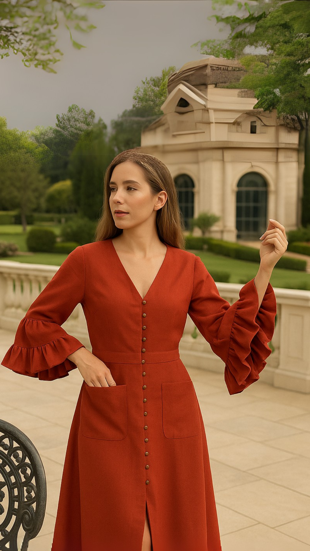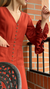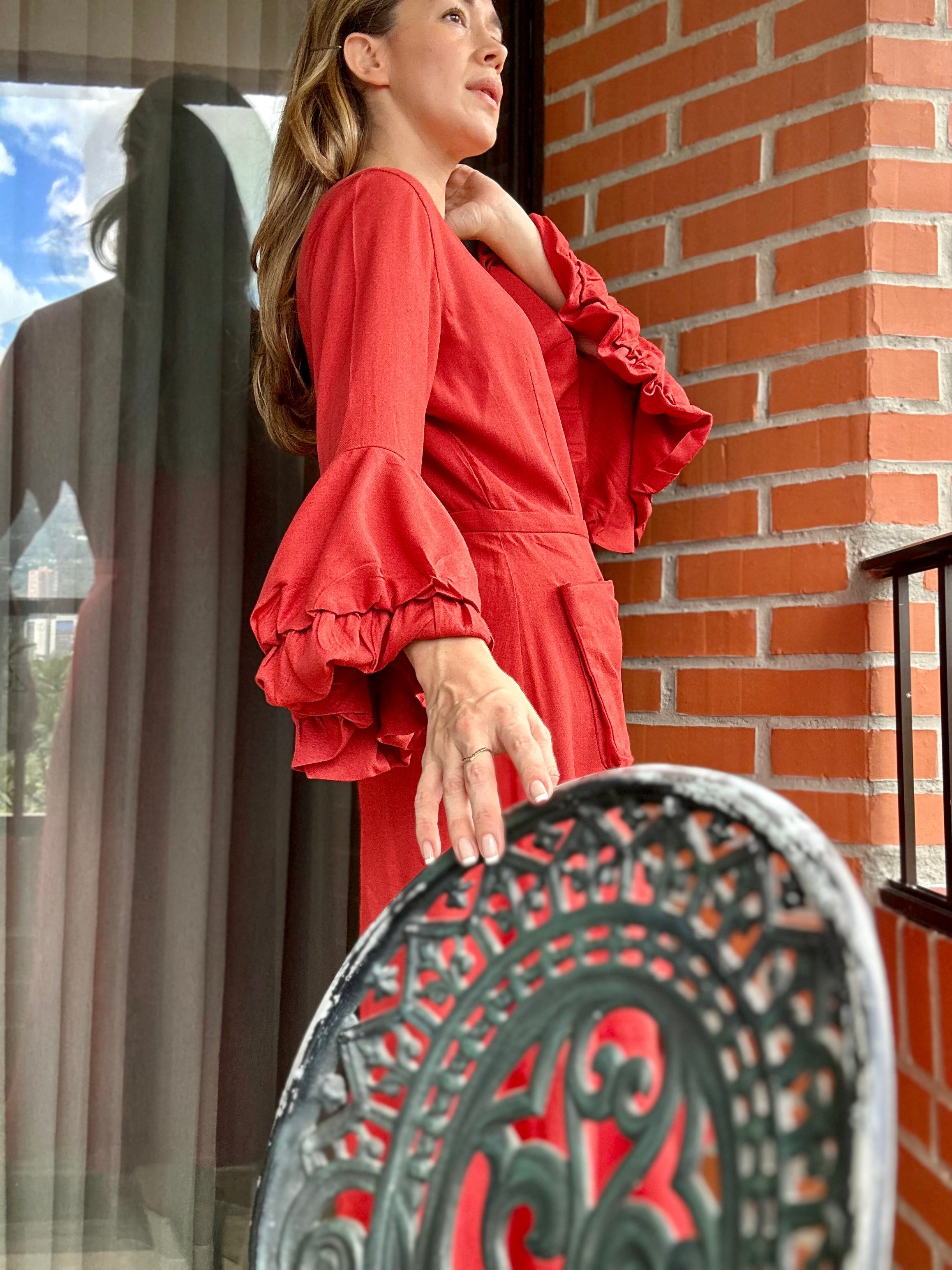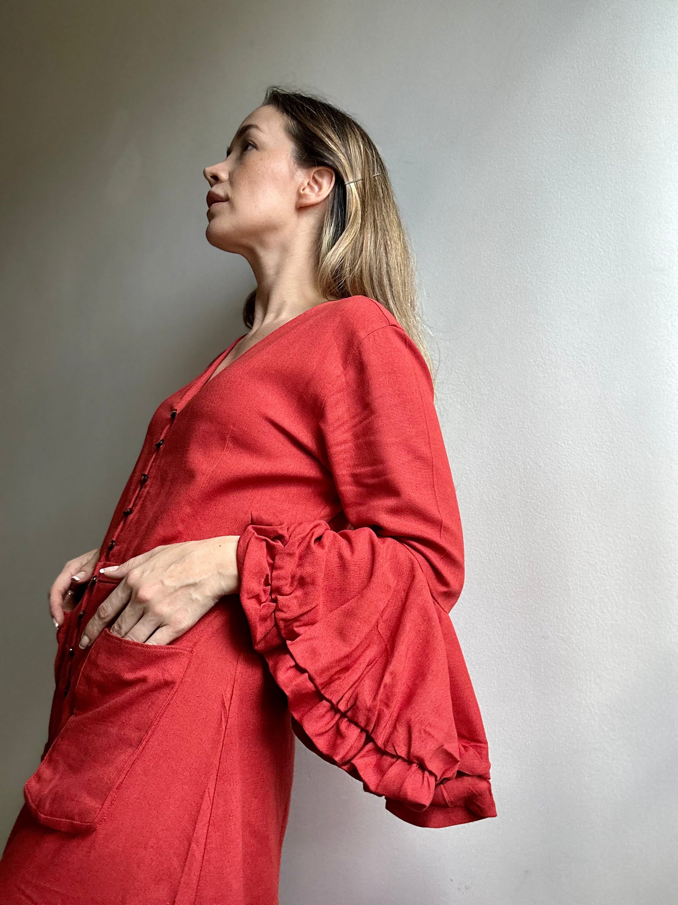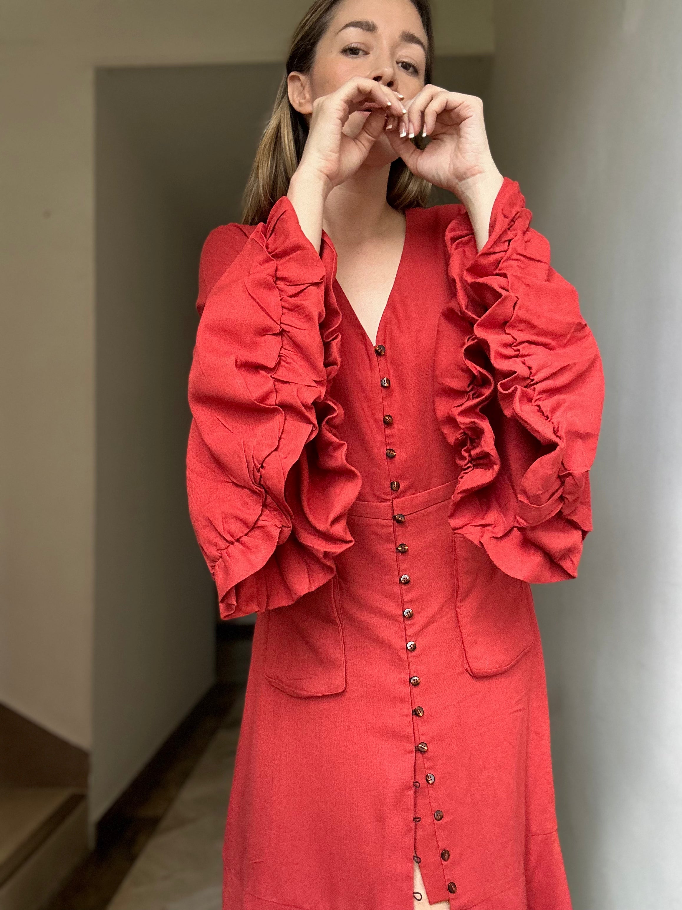 VESTIDO TERRACOTA, CON ROSA EN MANGAS