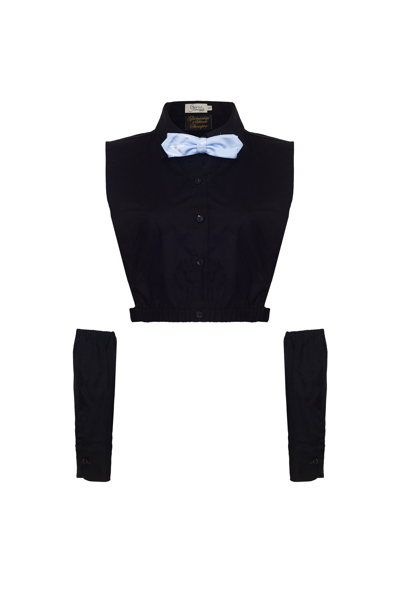 Este diseño incorpora un corbatín removible, perfecto para adaptar el look según la ocasión. El cuello y los puños versátiles añaden sofisticación, mientras que los puños sueltos con bordado aportan un detalle artesanal que realza cualquier estilo.