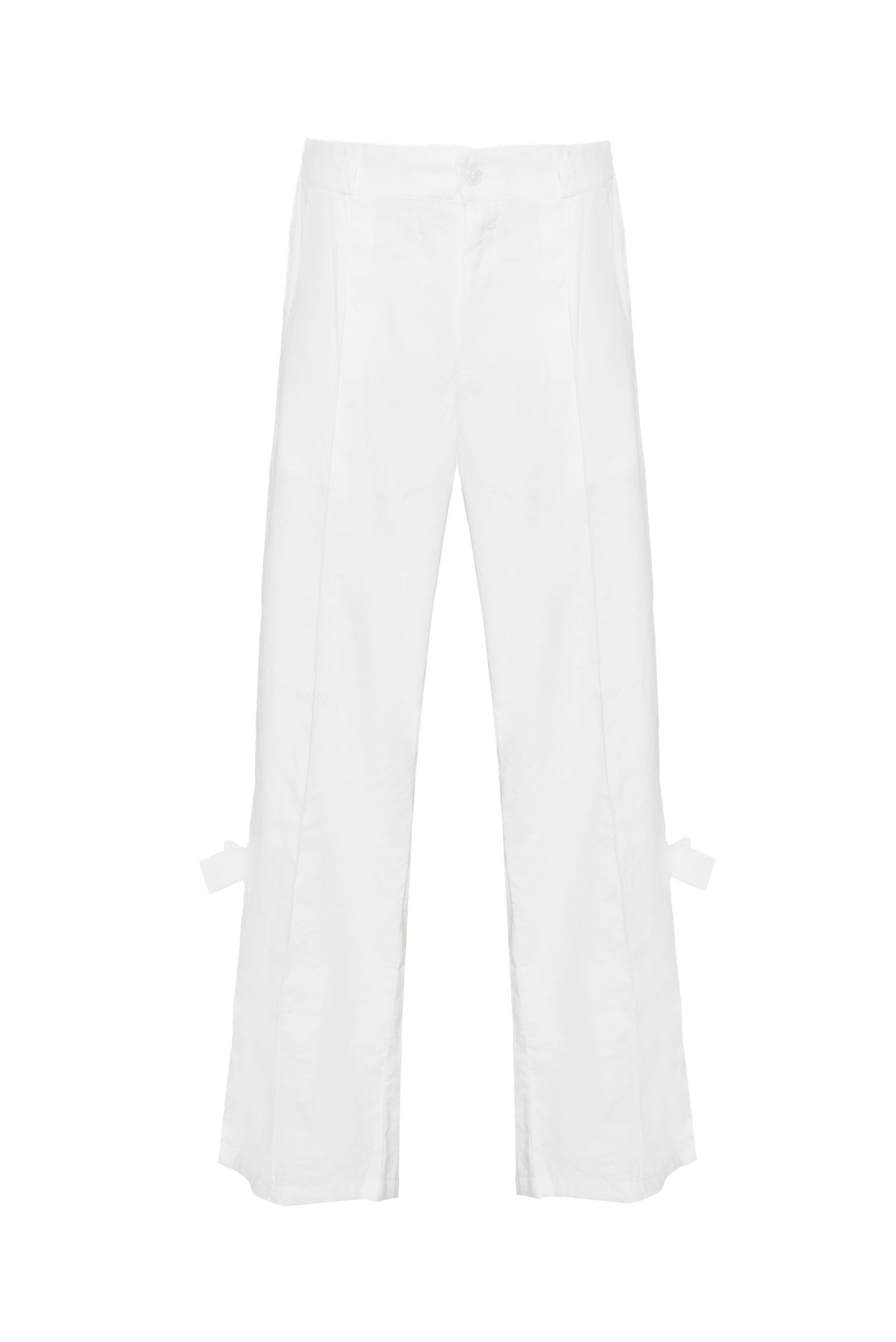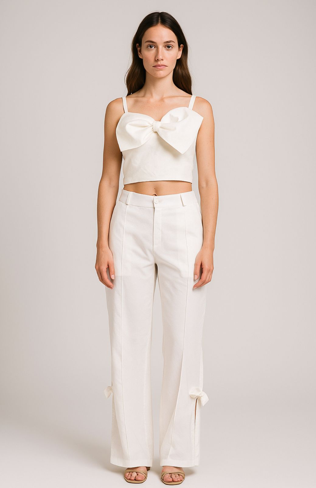 Un pantalón Ivory lleno de detalles únicos que elevan cualquier look. Su diseño recto estiliza la figura y sus pequeños lazos laterales añaden un toque distintivo y femenino.