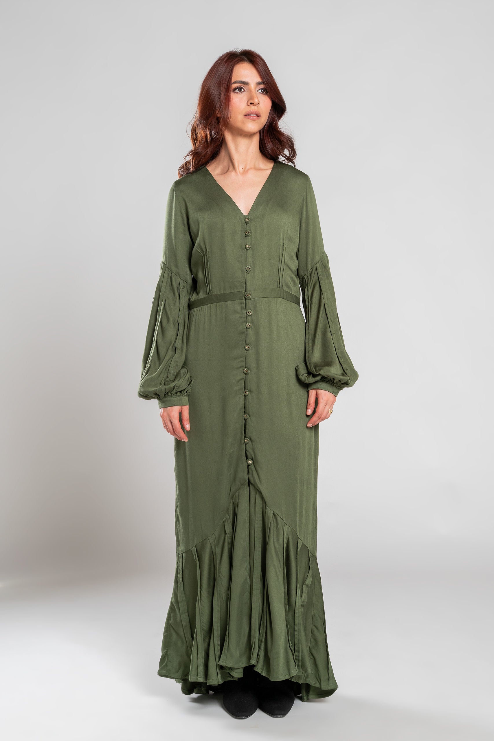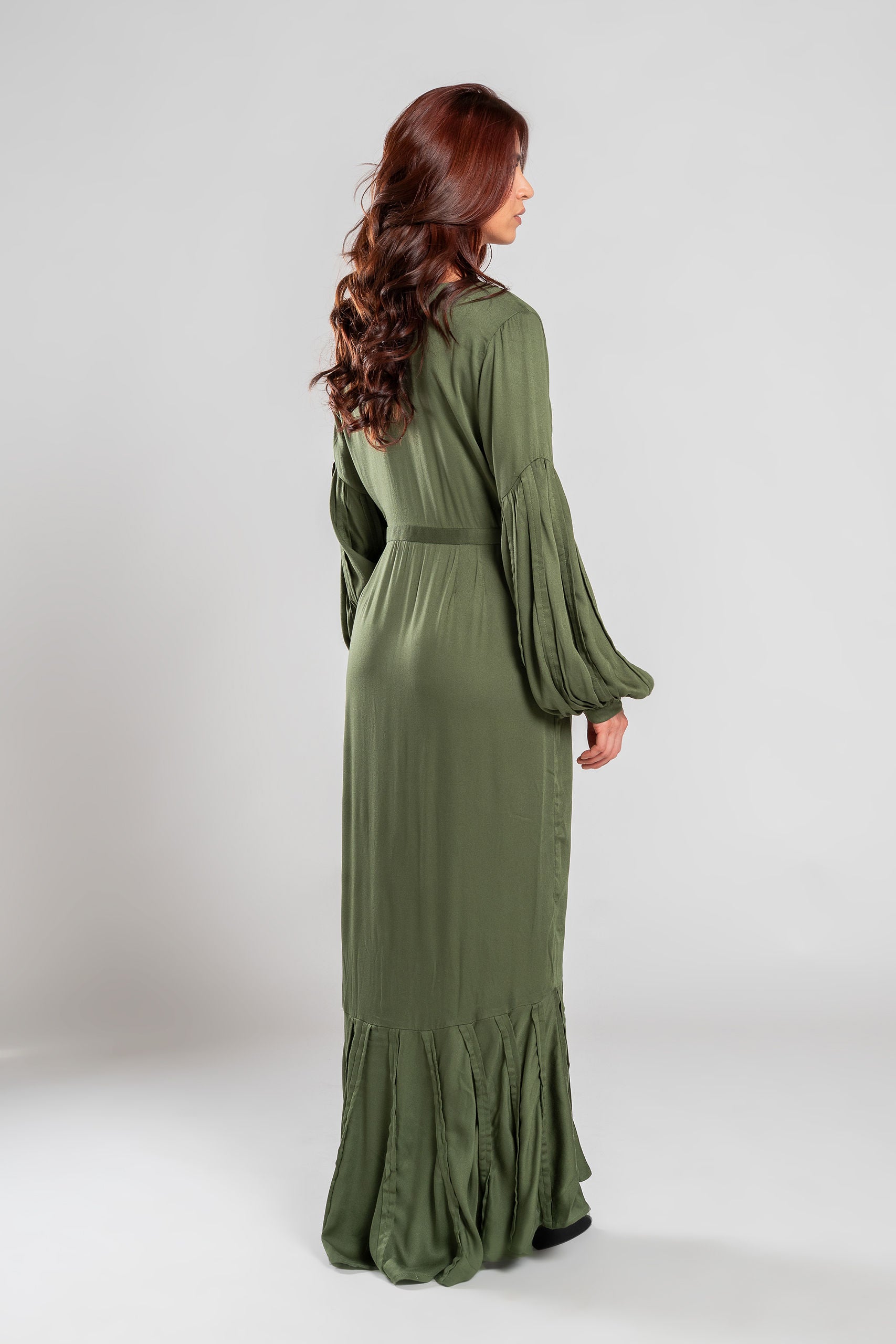Vestido largo para mujer con con mangas abullonadas, bolero en bajo. Un diseño romántico y moderno para toda ocasión.